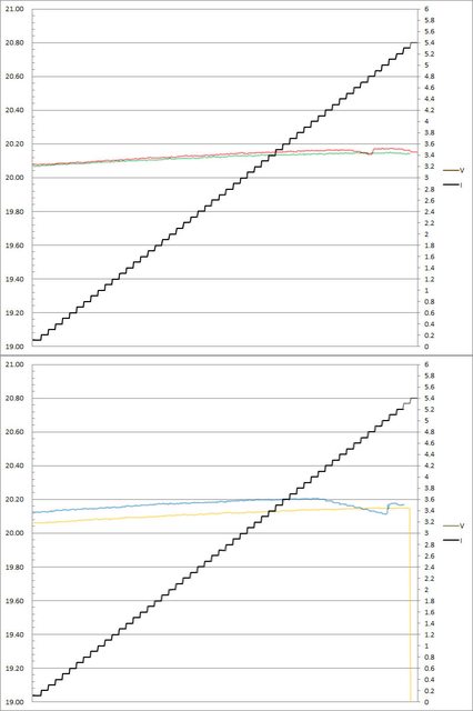 輸出電壓上升,輸出電流超過3.2A(C3)/3.3A(C1/C2/C4)截止