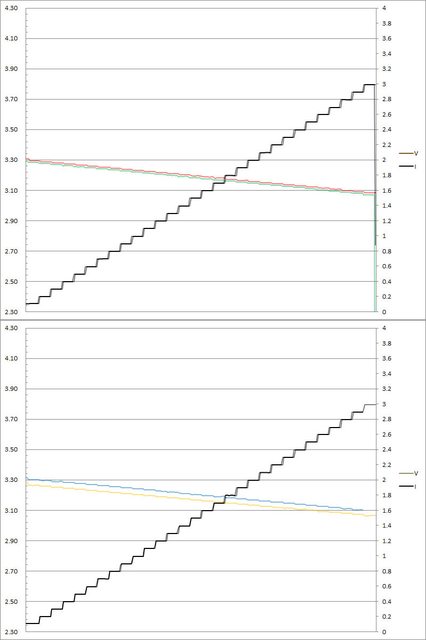 ▼C1(紅)/C2(綠)/C3(藍)/C4(黃)搭配3A線材的PPS檔3.3V輸出負載測試,隨著電流增加,