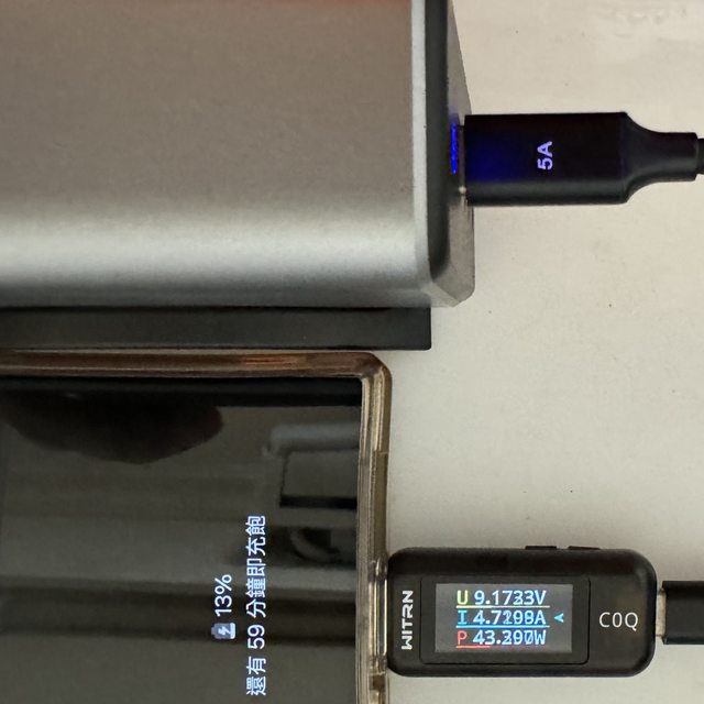 ▼使用5A線材連接三星S23 Ultra,於低電量下可觸發超快速充電2.0的45W充電