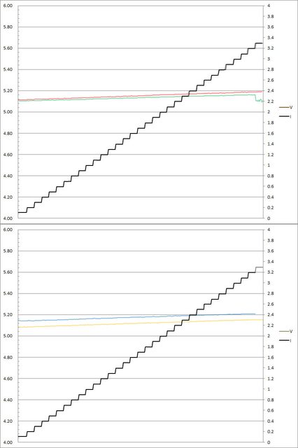 ▼C1(紅)/C2(綠)/C3(藍)/C4(黃)搭配5A線材的固定檔5V輸出負載測試,隨著電流增加,