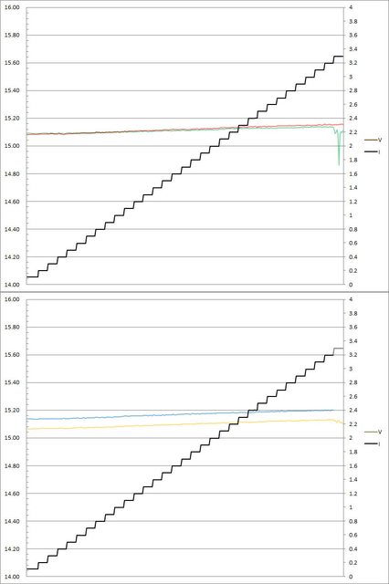 ▼C1(紅)/C2(綠)/C3(藍)/C4(黃)搭配5A線材的固定檔15V輸出負載測試,隨著電流增加,
