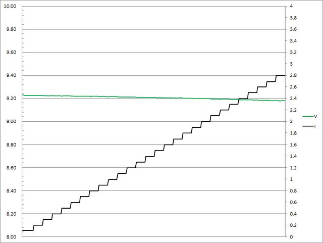 ▼USB-C2的固定檔9V輸出負載測試,隨著電流增加,輸出電壓下降,輸出電流超過2.8A截