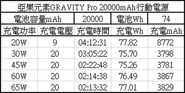 ▼使用不同功率充電器將電量耗盡行動電源完全充飽所需的充電時間、充電Wh、充電mAh