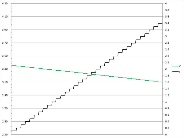 ▼USB-C2的第二組PPS檔3.3V輸出負載測試,隨著電流增加,輸出電壓下降,輸出電流超