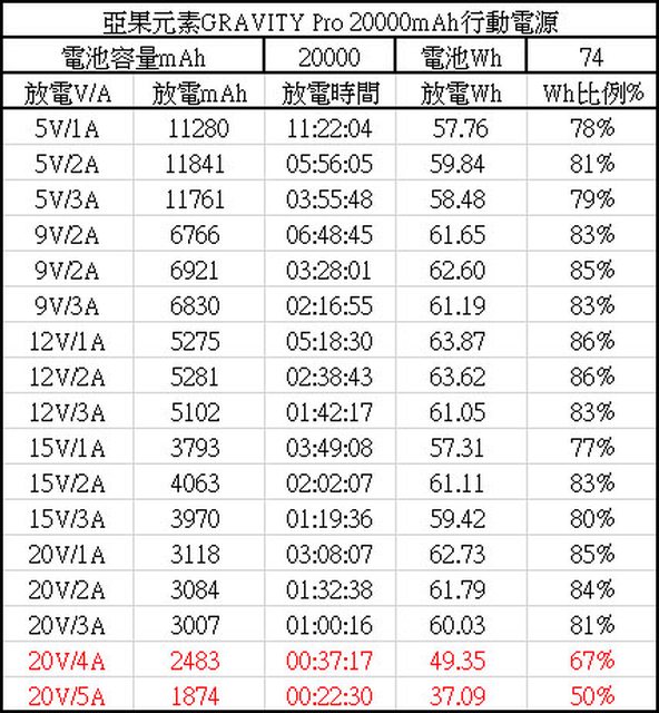 ▼各組放電V/A的放電mAh、放電時間、放電Wh、Wh比例百分比,5V/9V/12V/15V/20V的