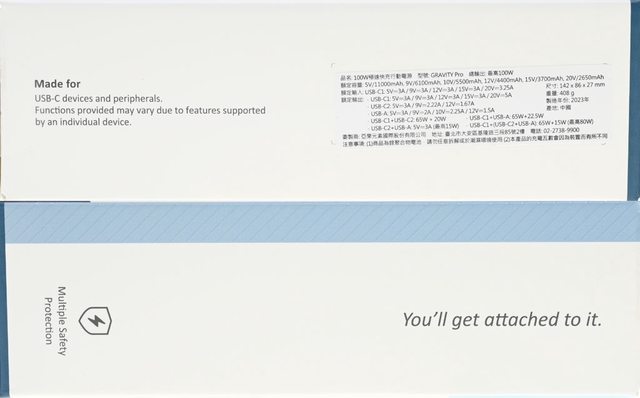 ▼外盒左/右側面有適用裝置、中文產品規格/廠商資訊貼紙、標語、多重安全保護標示