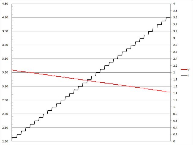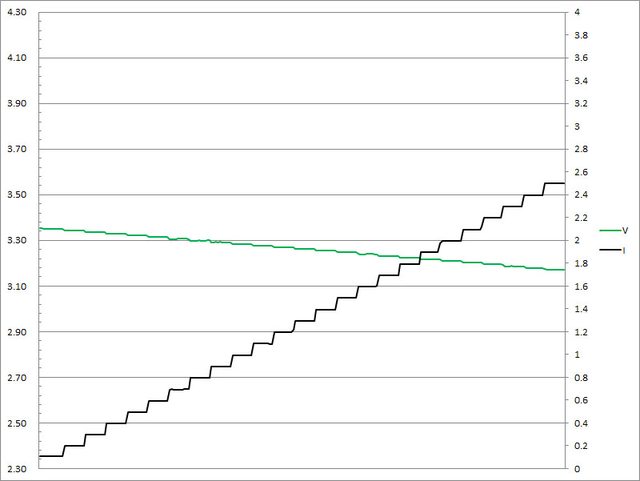 ▼USB-C2的第一組PPS檔3.3V輸出負載測試,隨著電流增加,輸出電壓下降,輸出電流超