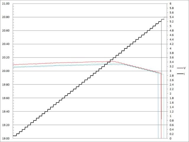 幅壓降,超過5.4A截止;C3輸出電流超過5.1A大幅壓降,超過5.2A截止