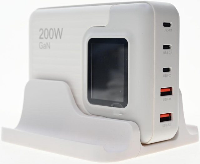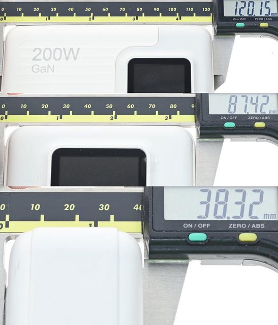 ▼充電器採雙色外殼,其中一個較大的側面有200W/GaN字樣、商標、螢幕