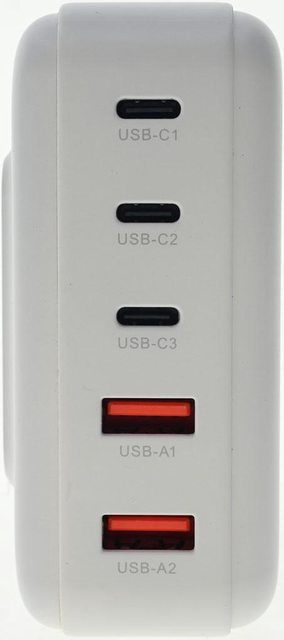 ●具備3個USB-C及2個USB-A輸出,自動偵測主流快充協議,C1/C2/C3最大單埠輸出100W,