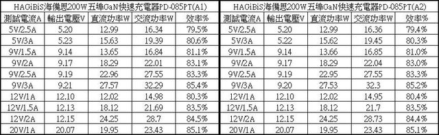 ▼A1/A2單獨使用下各組輸出轉換效率表,整體輸出轉換效率在79.4%至85.4%之間