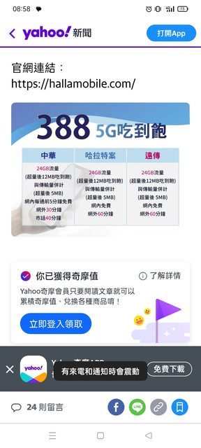 → manbow77 : 流量只給24G 超量後頻寬只剩12M 辦中華4G比較實在 03/16 12:55