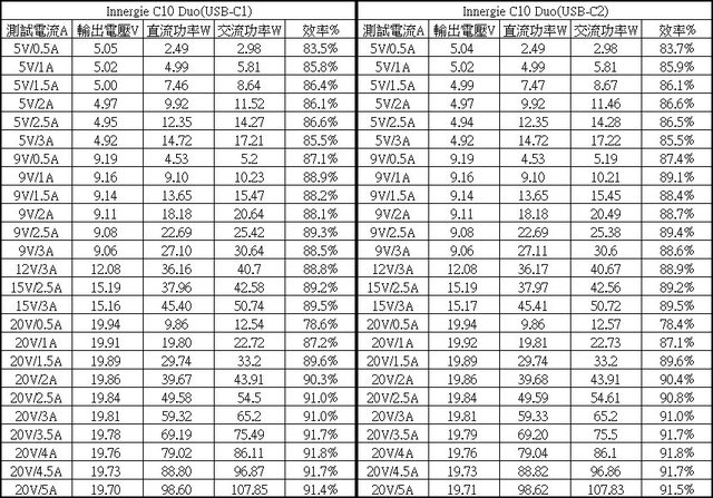 ▼C1/C2單獨使用下各組輸出轉換效率表,整體輸出轉換效率在78.4%至91.8%之間