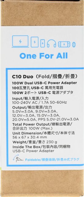 ▼外盒右側面有One For Al字樣、產品名稱、規格標示、包裝內容、摺疊插頭示意圖