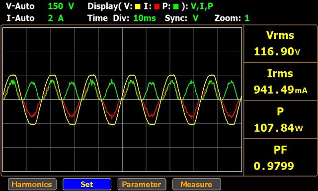▼單埠輸出100W的交流輸入電壓/電流/功率波形如下圖所示,此時功率因數0.9799