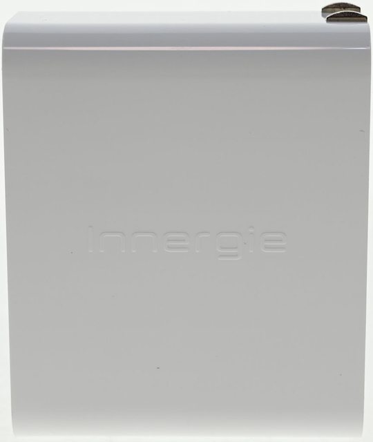▼無縫接合設計的圓弧邊白色亮面外殼,較大的側面中間有Innergie商標字樣凸印
