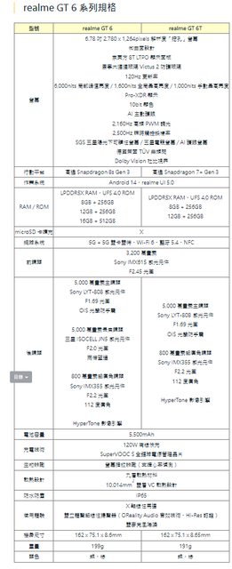 realme GT 6 與 GT 6T 規格相近,只在處理器、主相機、機身尺寸、重量等細節規格有