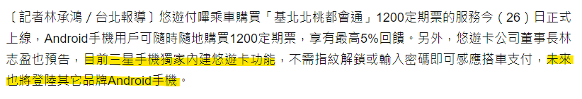 推 ssshleo : 另一篇新聞已經有寫其他安卓會朝著spay悠遊卡方向走 09/27 13:25