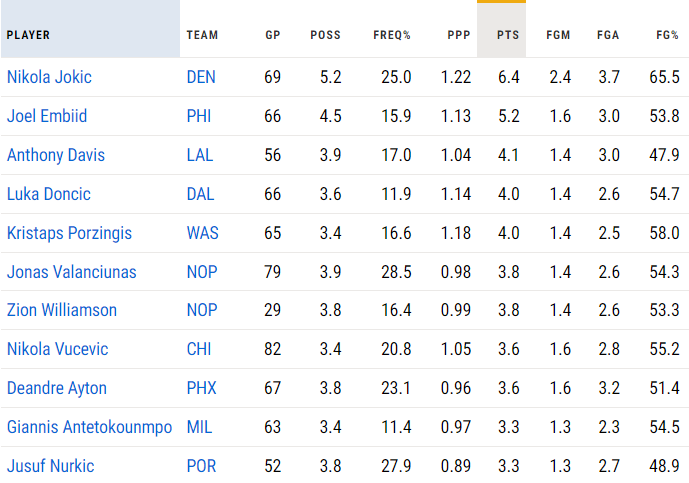 1.Jokic 場均 低位單打9.1次 命中率65.8% 得5分 1.2助攻 2.Joel Embiid 場均 低位單打6.5次 命中率50.5% 得4.5分 0.3助攻 3.Nikola Vucevic 場均 低位單打5.4次 命中率53.7% 得2.8分 0.4助攻 4.Anthony Davis 場均 低位單打5.2次 命中率49.3% 得3.6分 0.3助攻 5.Jonas Valanciunas 場均 低位單打4.9次 命中率53.9% 得3.2分 0.4助攻 6.Jusuf Nurkic 場均 低位單打4.5次 命中率45.8% 得2.7分 1.2助攻 7.Domantas Sabonis 場均 低位單打4.4次 命中率56.2% 得2.1分 0.6助攻 8.Luka Doncic 場均 低位單打4.4次 命中率55.5% 得3.1分 0.3助攻 9.Alperen Sengun 場均 低位單打4.3次 命中率54.1% 得2.3分 0.4助攻 10.Giannis Antetokounmpo 場均 低位單打4.3次 命中率43.3% 得1.9分 0.5助攻 繼續來救快死掉的技術 -- ※ 發信站: 批踢踢實業坊(pttbestweb.org.tw), 來自: 59.115.107.21 (臺灣) ※ 文章網址: https://pttbestweb.org.tw/NBA/M.1689501167.A.042