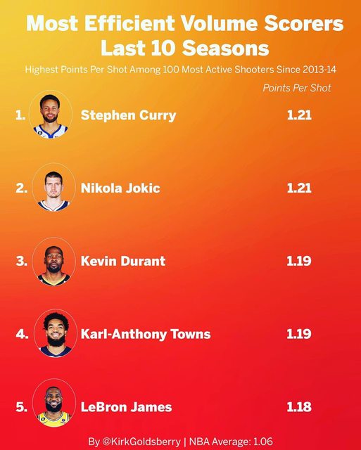 Cool list. Did not expect to see KAT on here though. What else jumps out? 近十年前100名大量出手球員中,每次出手得分(Points Per Shot)的Top5: 1. Curry - 1.21 2. Jokic - 1.21 3. KD - 1.19 4. KAT - 1.19 5. LBJ - 1.18 (NBA平均為1.06) 酷名單。沒想到KAT會出現在這裡。 軟糖的出手得分效率比詹皇高,真的假的? 咖哩跟小丑,當代最有效率的兩位得分手。 -- ※ 發信站: 批踢踢實業坊(pttbestweb.org.tw), 來自: 1.200.59.14 (臺灣) ※ 文章網址: https://pttbestweb.org.tw/NBA/M.1690583697.A.6D1