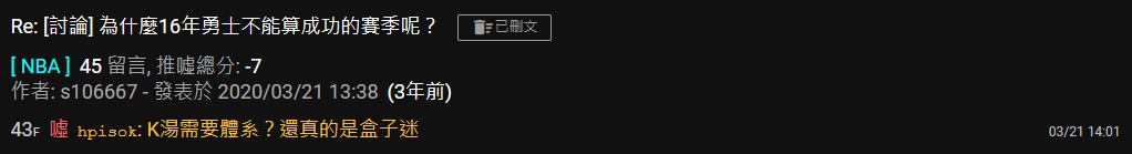 噓 Max7169 : 可是前n板主以前還說勇士是KT帶隊的欸 結果現在變 11/17 19:25