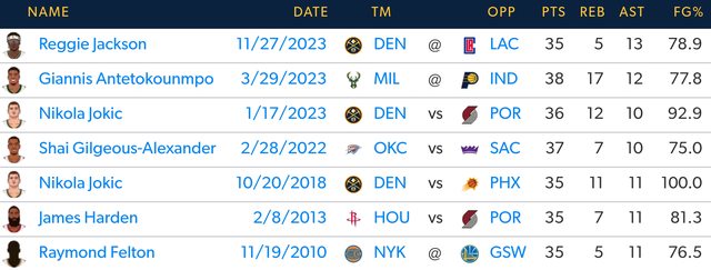 https://twitter.com/statmuse/status/1729382281066782863 The only players in the 2020s to record 35+ PTS 5+ REB 10+ AST 75+ FG% in a game. http://i.imgur.com/rrR0iAG.jpg