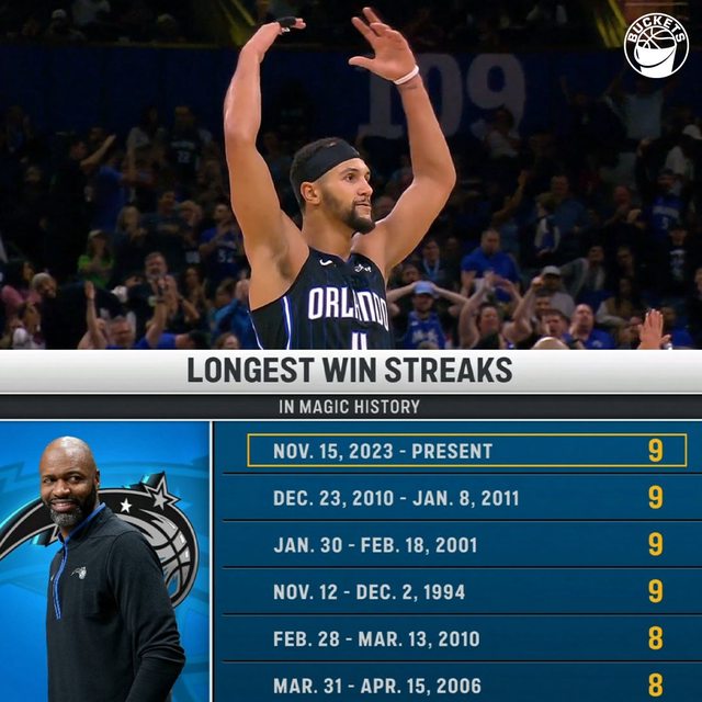 https://twitter.com/buckets/status/1730780099178602714 9 straight wins for the orlando magic 奧蘭多魔術隊近況火熱 拉出一波9連勝 追平10-11賽季的隊史最佳紀錄 https://i.imgur.com/Xtshjja.jpg
