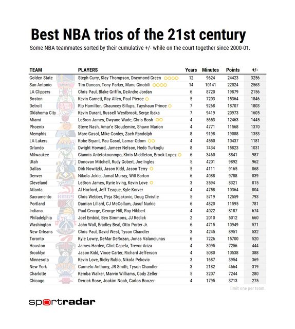 https://twitter.com/CrumpledJumper/status/1730744196825583963 Todd Whitehead Synergy Sport分析師 嘗試猜測自2000年以來,每支球隊最佳的3人組 (+/-值) https://i.imgur.com/rmngESF.jpg