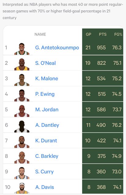 字母哥也創下個人NBA生涯第20場40分,又保有70%頂級命中率的比賽;
