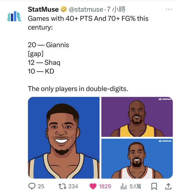 本世紀此表現能達到雙位數場次(10場)的球星除了字母哥,也只有2位-Shaq與KD