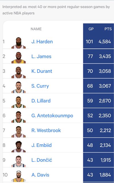 Most 40 or more point regular-season games by active NBA players