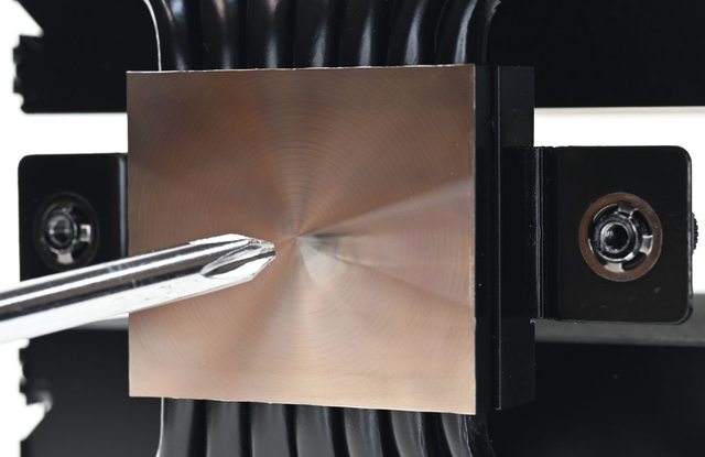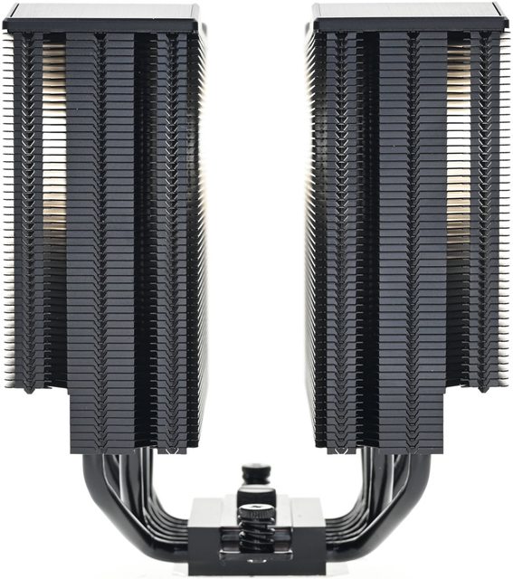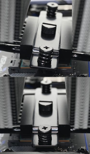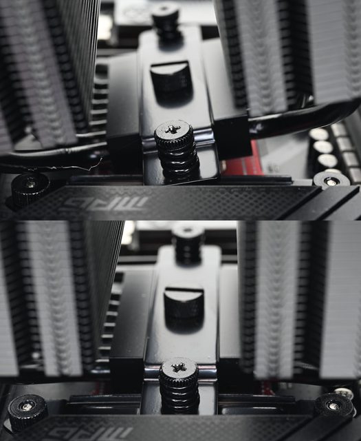 ▼從側面看,雙塔下方9片散熱鰭片縮小,壓板中間用1個手轉螺絲固定在散熱器底座頂部