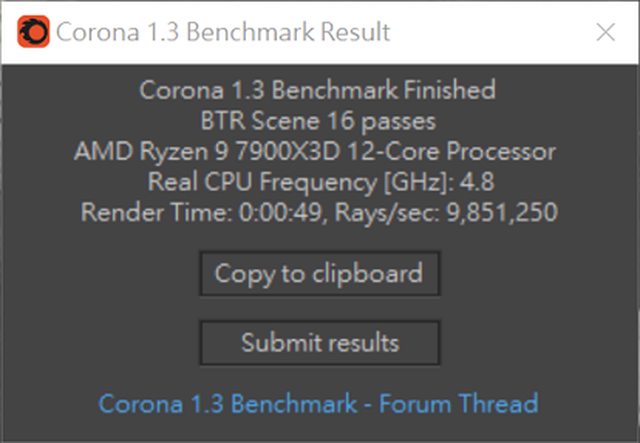 Corona BenchmarK (Render Time 0:00:49, Rays/sec 9,851,250)