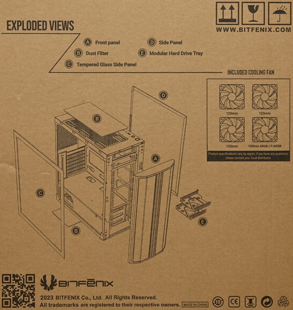 ▼此面外箱有運輸注意圖示、原廠網址、說明爆炸圖、隨附風扇尺寸/數量、QR碼、商標