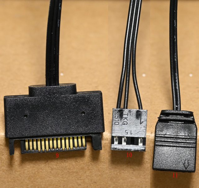 ▼燈光風扇控制板連接線組,9為SATA電源輸入接頭,10為PWM連動控制及風扇轉速回傳