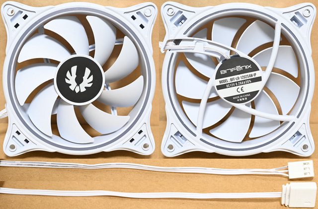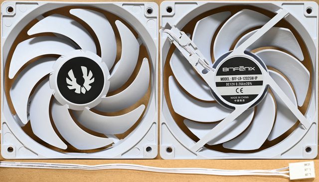 ▼120mm風扇,型號BFF-LR-12025W-IP,9葉片白色扇葉軸心有商標,白色外框中央貼紙上