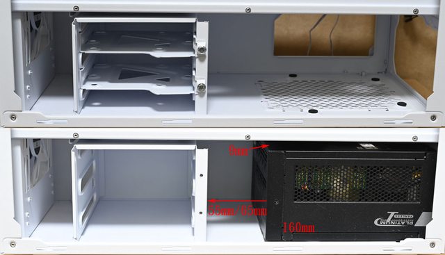 距離為55mm(固定架開口邊緣)/65mm(固定架側面),電源供應器上方與電源艙頂部距離9mm