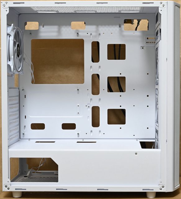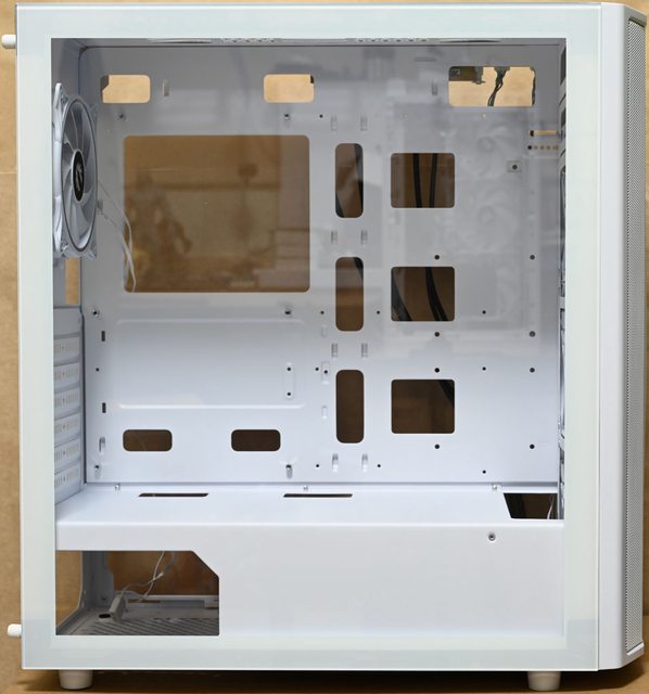 ▼後方預裝1個ARGB LED發光120mm風扇,主機板安裝底板上方鏤空,方便拆裝CPU散熱器