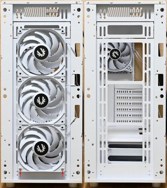 冷排可裝到280/360mm。特別注意最底部2個螺絲(紅色箭頭)為長螺絲,由前方鎖入固定