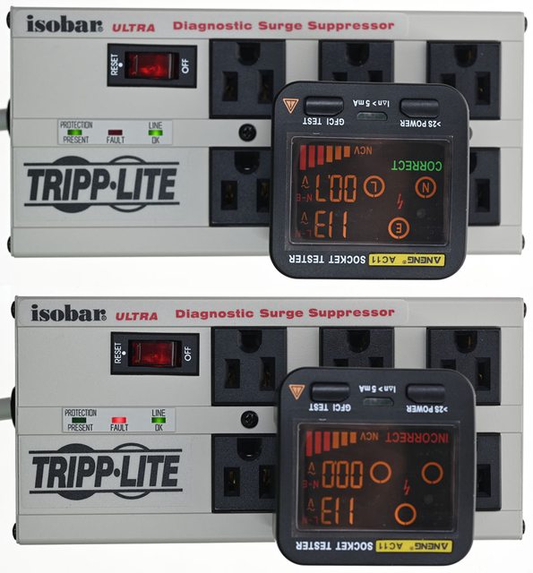 插座接線異常,“PROTECTION PRESENT”指示燈點亮表示突波吸收及雜訊抑制運作正常