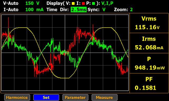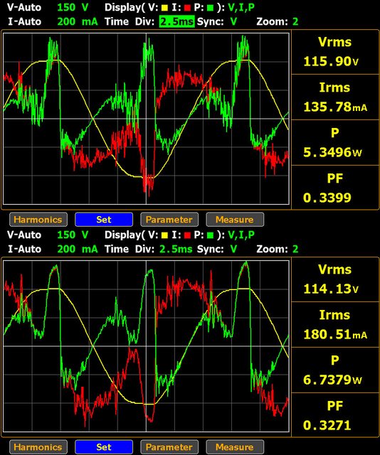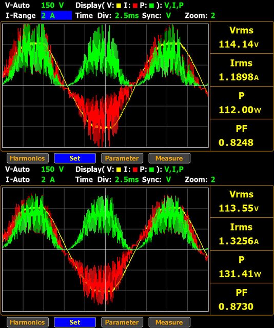 線時交流電壓(黃色)/電流(紅色)/功率(綠色)波形,使用延長線時波形較為平滑,波形上