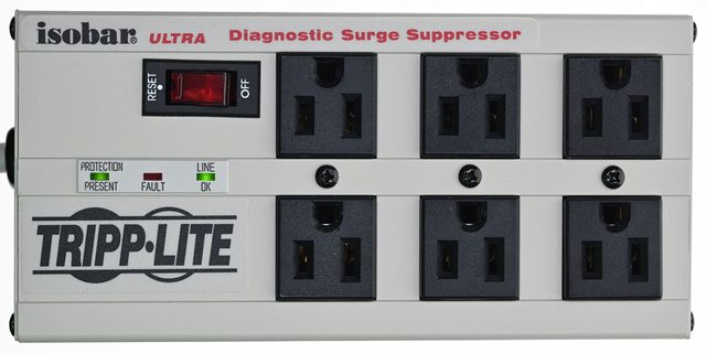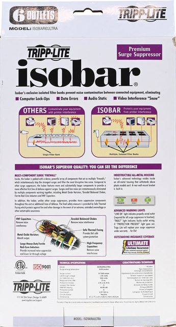 。本體正面有isobar ULTRA Diagnostic Surge Suppressor字樣、電源/過載開關、