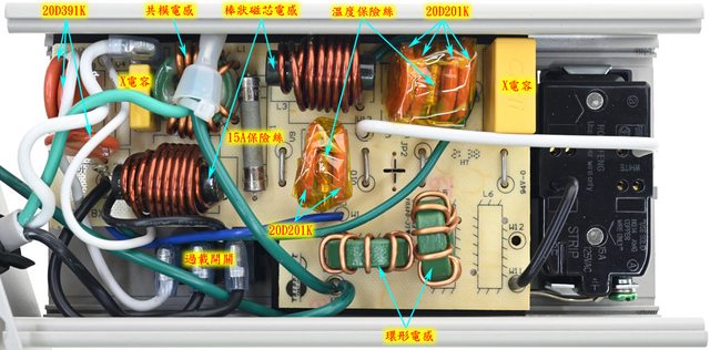 阻(吸收突波)、環形平衡扼流圈(消除電力線雜訊干擾)、大型重負載鐵氧體棒狀磁芯電感