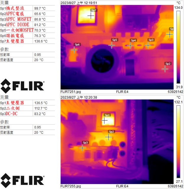 振電感/主變壓器(上圖)及主變壓器/二次側/DC-DC(下圖)的紅外線熱影像圖(附註:安裝