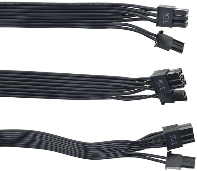 ▼3條顯示卡電源黑色帶狀模組化線路,提供3個PCIE 6+2P接頭,16AWG×6+18AWG×2線路