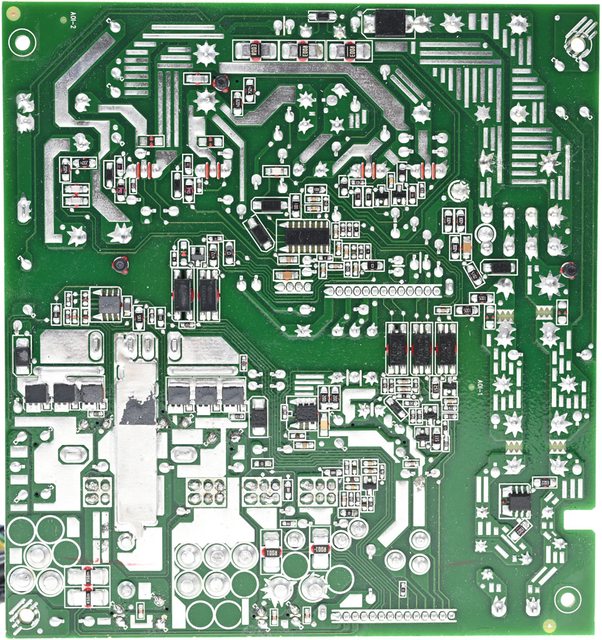 ○主電路板背面焊點做工良好,於二次側區域貼上導熱墊片,大電流線路有敷錫處理,