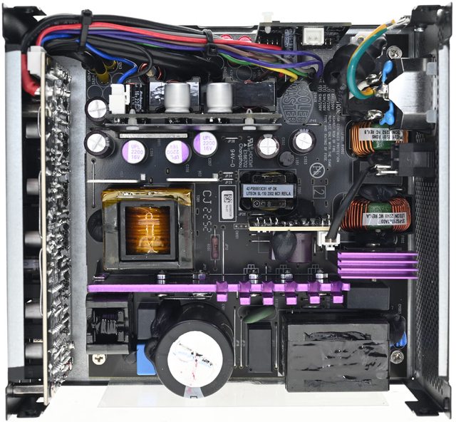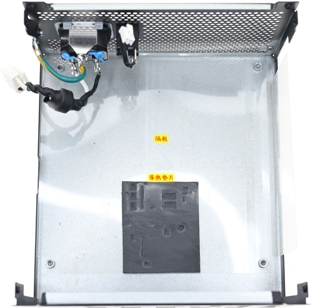 ▼本體出風口處設有交流輸入插座及電源總開關,透過網孔可看到內部紫色散熱片