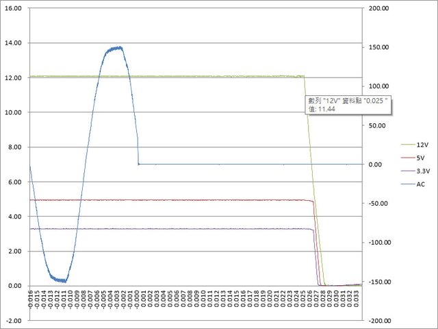○綜合全負載輸出狀態切斷AC輸入模擬電力中斷,12V於25ms降至11.44V