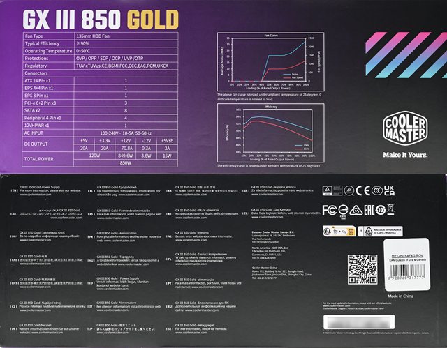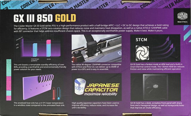 百分比圖表、轉換效率圖表、Cooler Master商標。外盒下側面有”GX III 850 GOLD電源