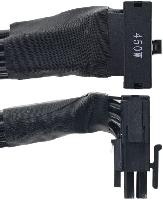 ▼顯示卡端直角12VHPWR接頭頂部上蓋有450W字樣,線路彎出部分使用纖維布膠帶固定在